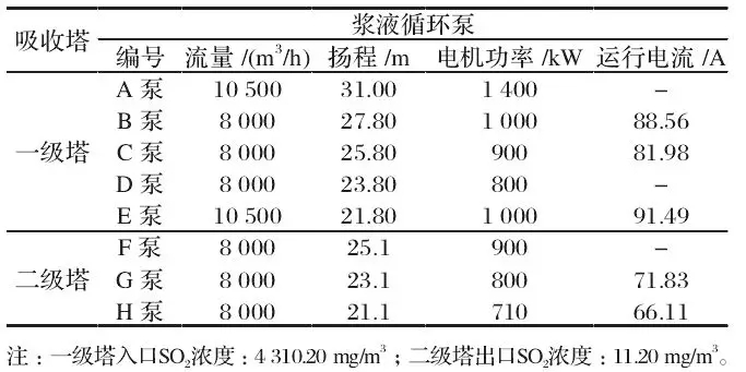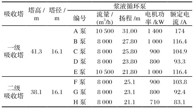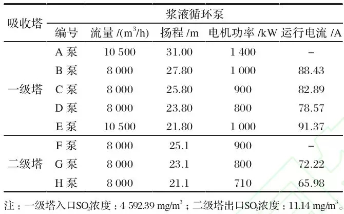 塔脫硫系統(tǒng)由原“1爐1塔”改為“一爐雙塔”,即在一級塔后新增二級塔,同時(shí),配套3臺脫硫漿液循環(huán)泵和2臺氧化風(fēng)機(jī)等,封堵旁路煙道。串聯(lián)塔共設(shè)3A~3H漿液循環(huán)泵8臺,其主要能耗參數(shù)如表1所示。